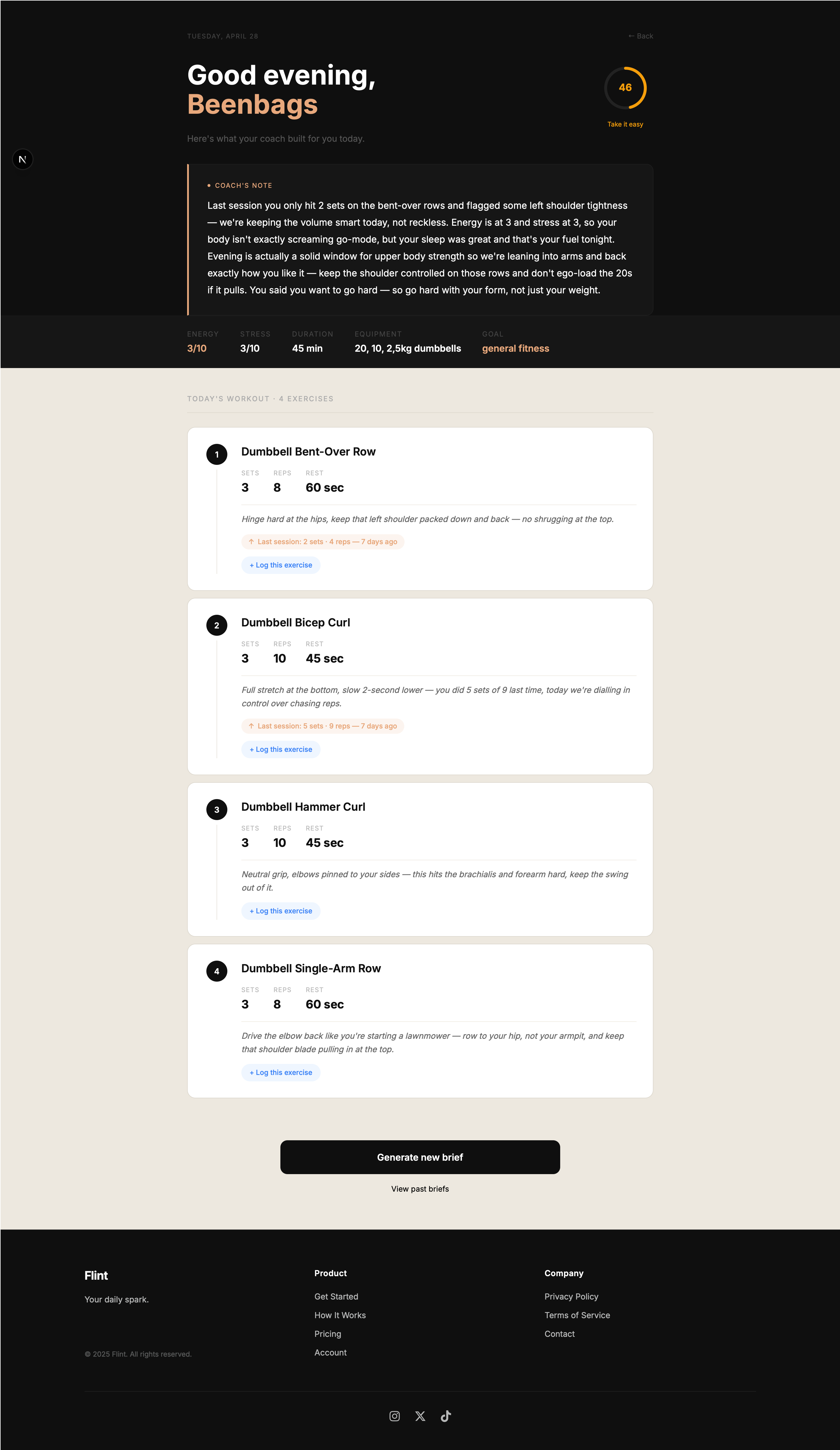 Log a session and your coach remembers. Next brief accounts for what you trained and what your body needs.